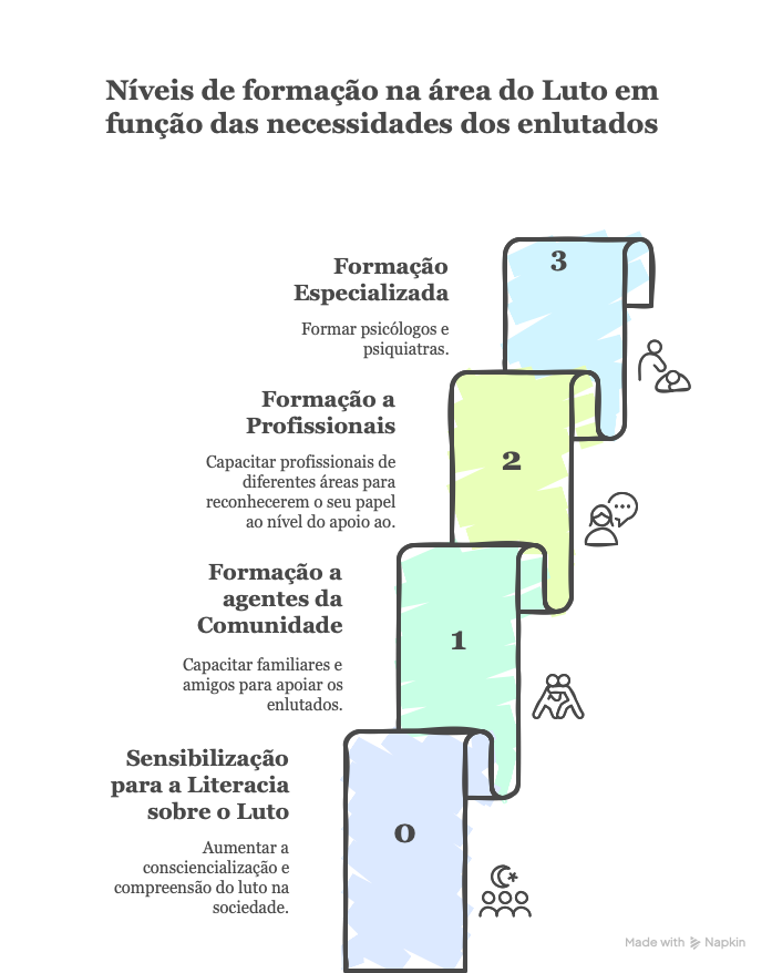 Formação Básica: Destinada a familiares e amigos que desejam compreender melhor o luto e as suas trajetórias. Este nível fornece ferramentas essenciais para oferecer apoio emocional adequado.